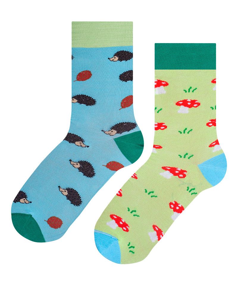 Сини и жълти чорапи с таралежи и гъбки